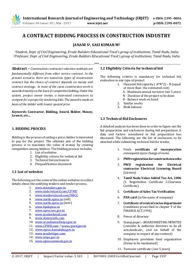 Contract bidding can prove a lucrative track, but the bidding process can feel byzantine to those ignorant of its structure and process. The grantee's architect usually prepares the bidding documents. So you want to be a contractor? This won't always be the cheapest, but that of course helps. The bidding process includes, 1. Pwd registration for construction works 4. It is very important for engineers who work in the field. But construction managers typically don't know what mistakes they're making in the bid proposal process. Competitive bidding methods 3 (a) all construction contracts must be awarded on the basis of competitive bidding unless an exception is granted thereby permitting contract negotiation. The client then selects the most suitable bidder for awarding the contract among all the eligible bidders. In the case of private construction contracts (as opposed to government contracts), the property owner requesting bids is free to accept or reject any. The owner is supposed to suggest. List of websites consequent upon change of name 2.