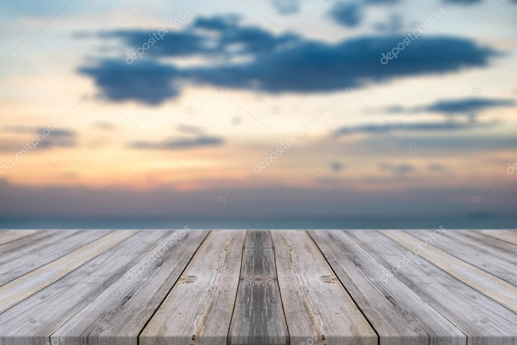 Light brown wooden planks as a wood table or parquet floor in perspective, isolated on blue sky or white clouds.